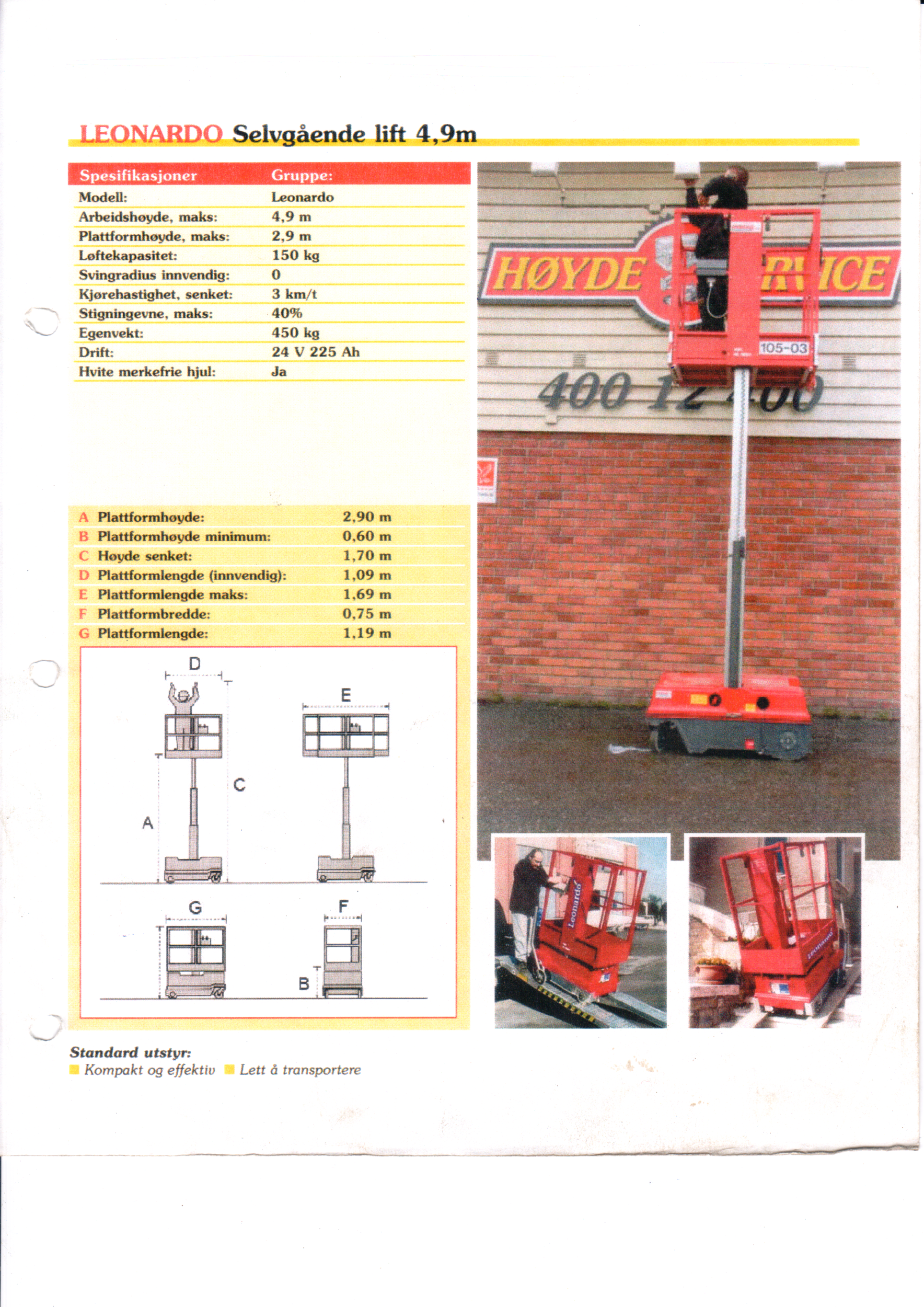 en kompakt vertikalløfter som gir arbeidshøyde opptil ca. 4,9 m, er batteridrevet, har maksimal plattformbelastning på 180 kg og egner seg godt for arbeid i trange områder og lavere høyder.